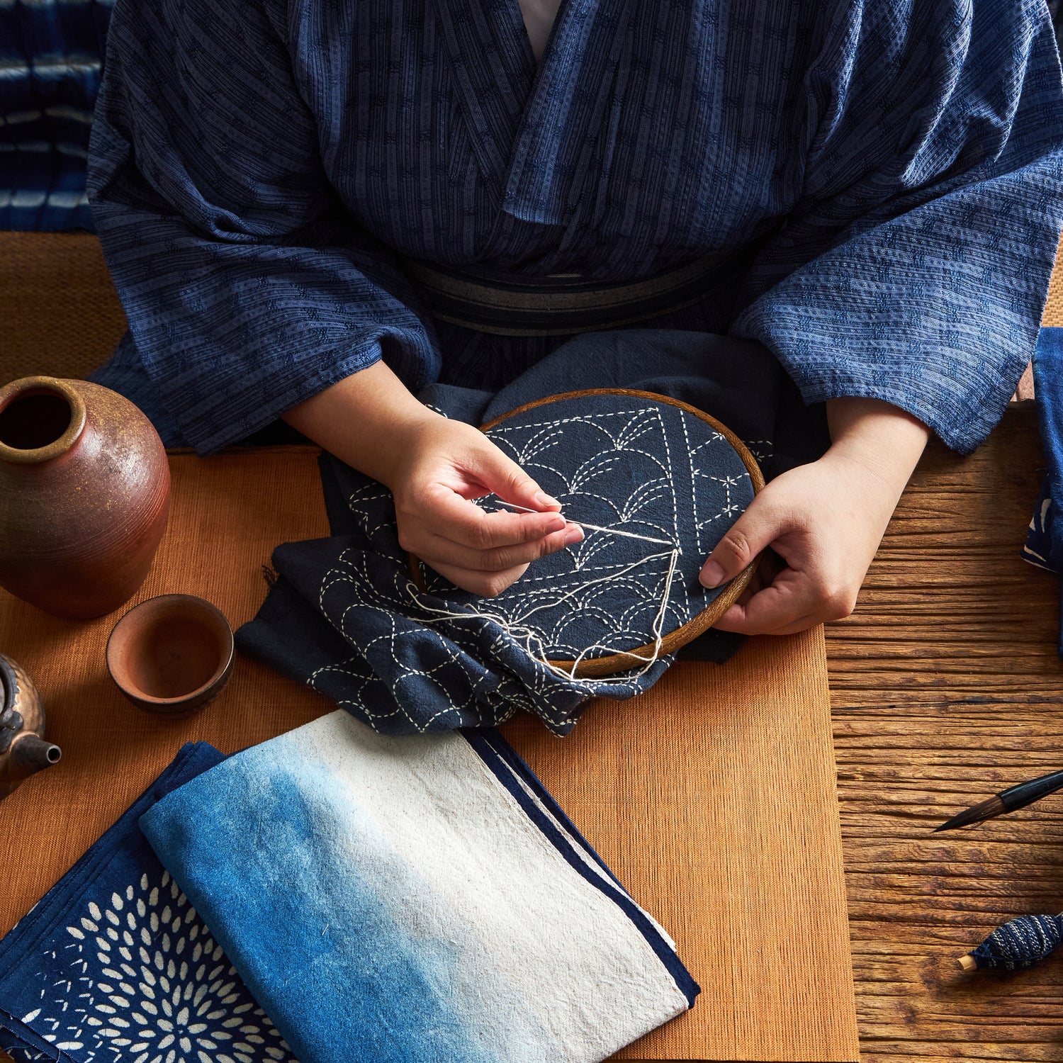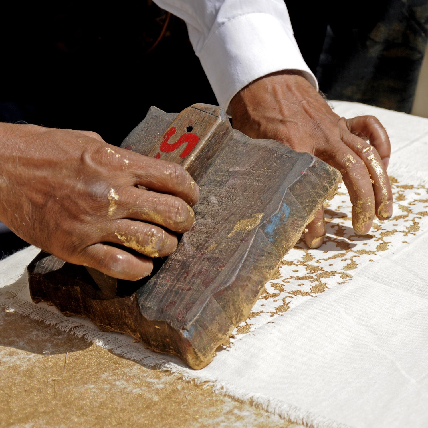 Les artisans trempent ensuite le bloc dans la couleur, puis le posent sur le tissu, à la main, avec une pression précise. Chaque motif est répété à l’œil, sans machine, sans repère numérique. Juste le regard et l’expérience.