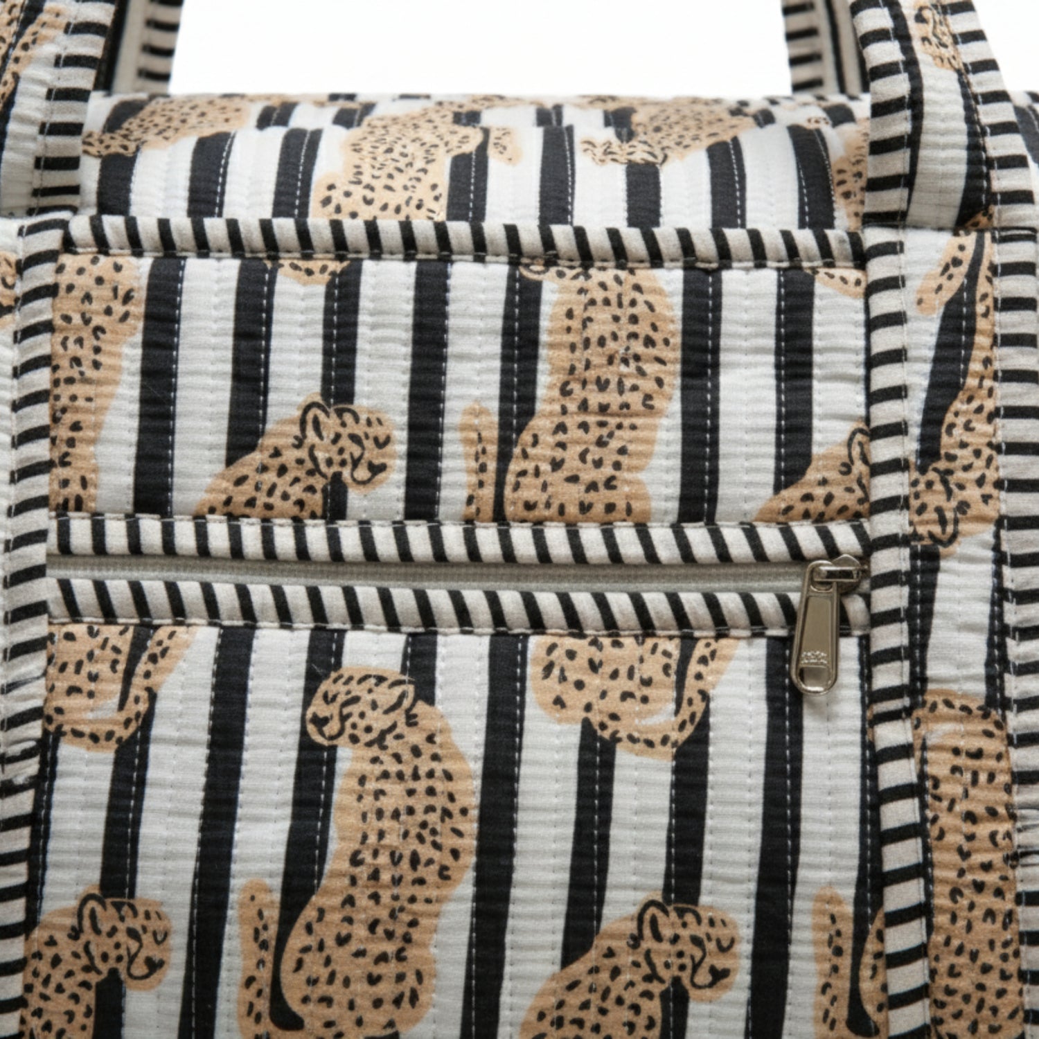 En coton imprimé main, Kumaon est un sac week-end léger et généreux. Une pièce nomade, façonnée pour suivre vos départs et retours.