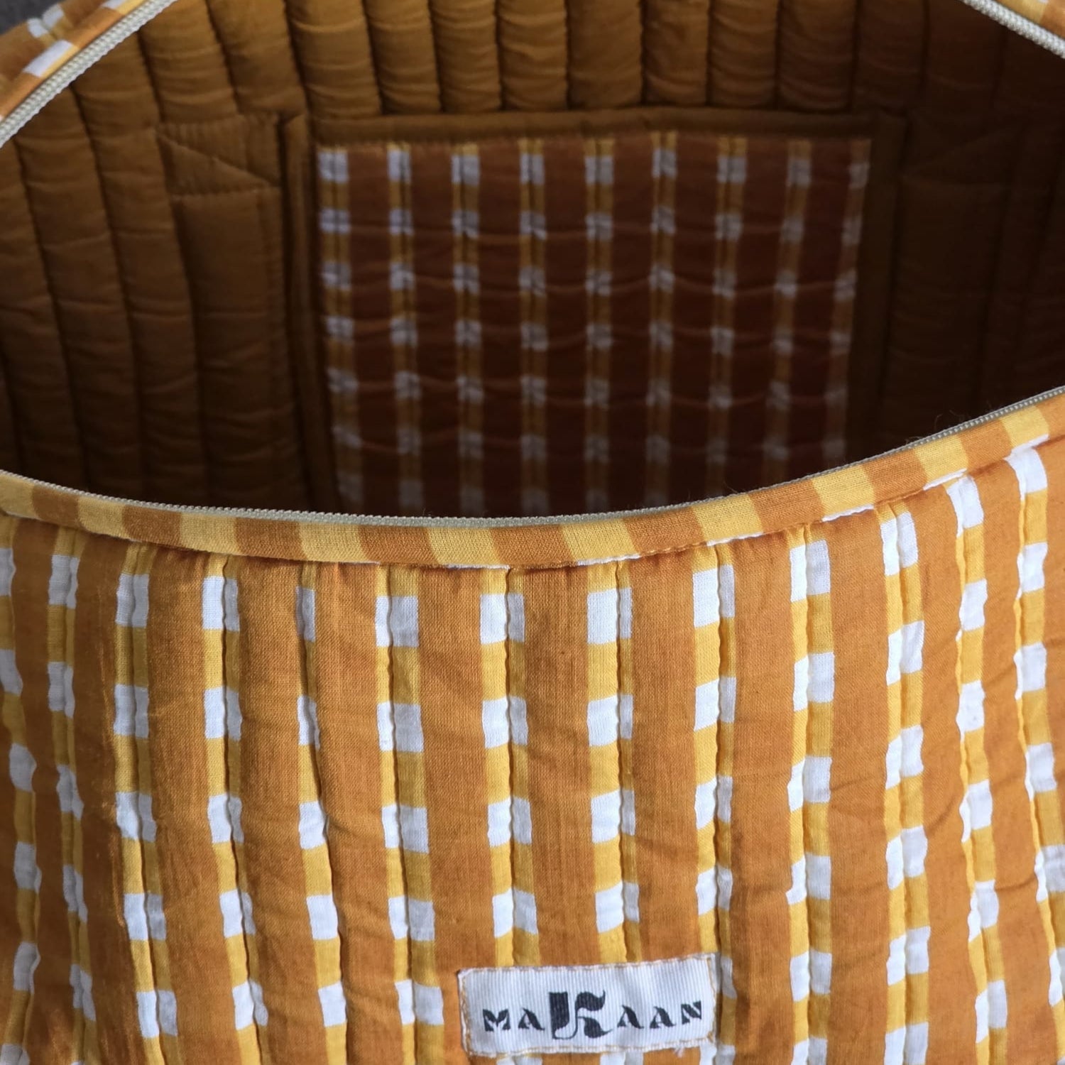 Surya est un sac week-end 100 % coton, imprimé à la main. Série limitée, il mêle poésie textile et praticité du quotidien.