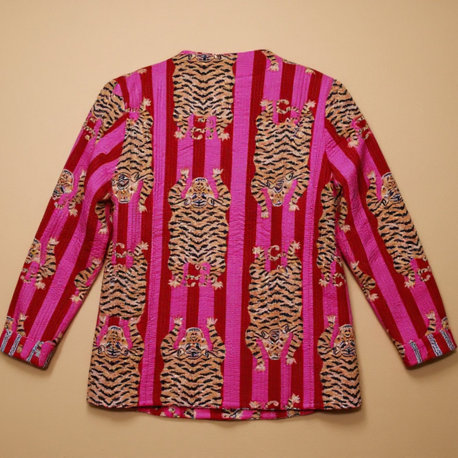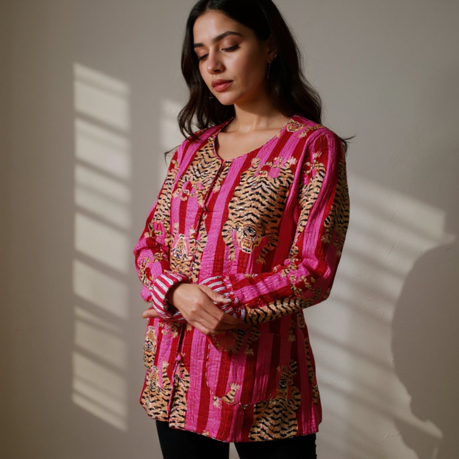 Découvrez la veste Indira, notre pièce iconique réversible à col rond.