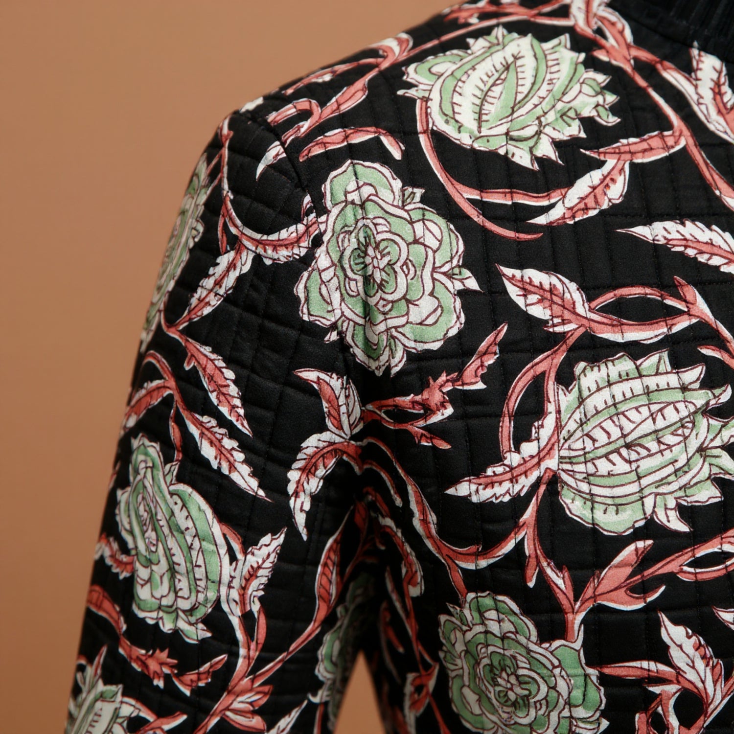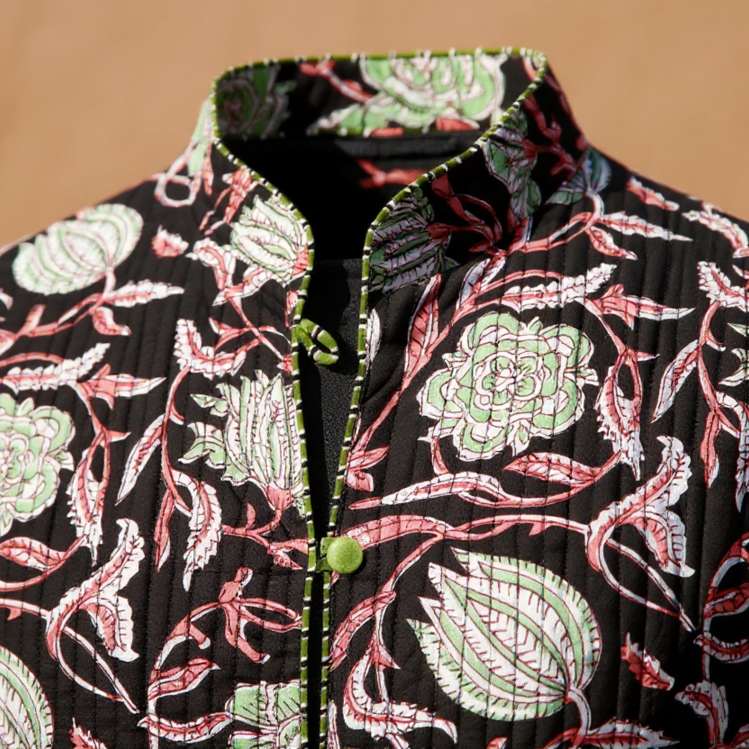 Imprimée à la main en Inde selon la technique du blockprint, elle révèle la singularité d’un motif inspiré par les gestes artisanaux.